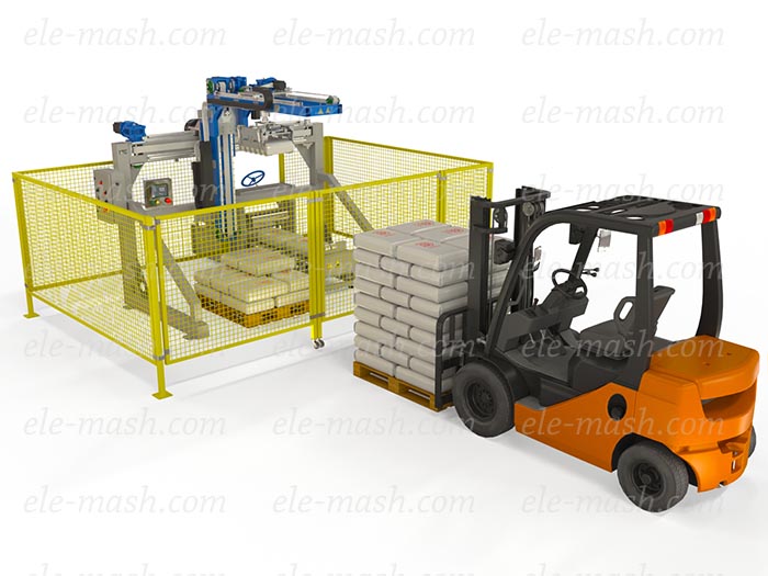 Palletizer with left-hand bag feeding and automatic pallet feeding: